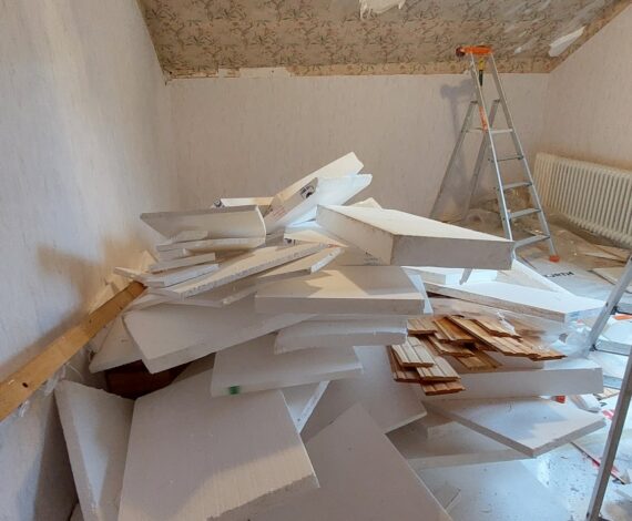 Vi henter avfall etter oppussing som murstein, fliser, papp, plast, isolasjon, vinduer, dører, gips, trevirke, gamle møbler, kjøkkenmøbler.